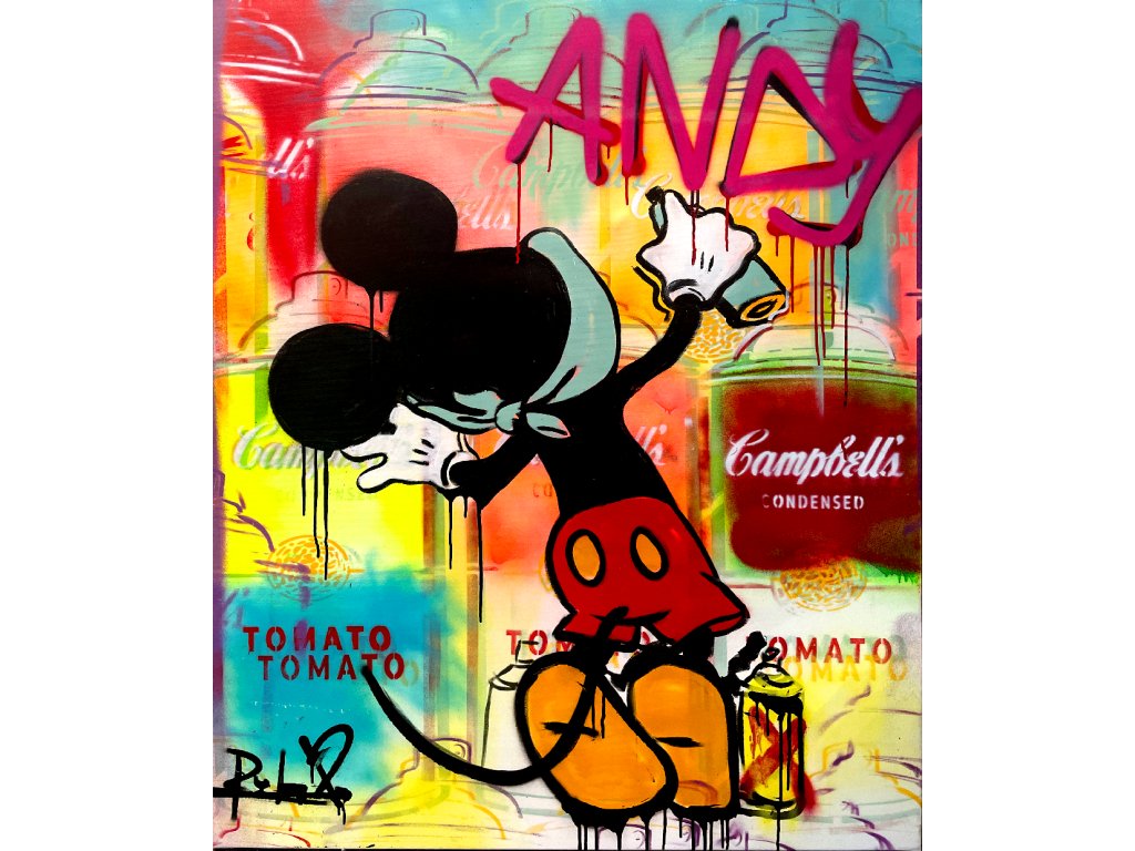 Klasická sochařská ikona v kontrastu s výbuchem barev, graffiti nápisů a pop-artových symbolů. Nečekané spojení minulosti a současnosti v energickém kolážovitém provedení.