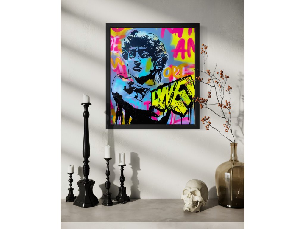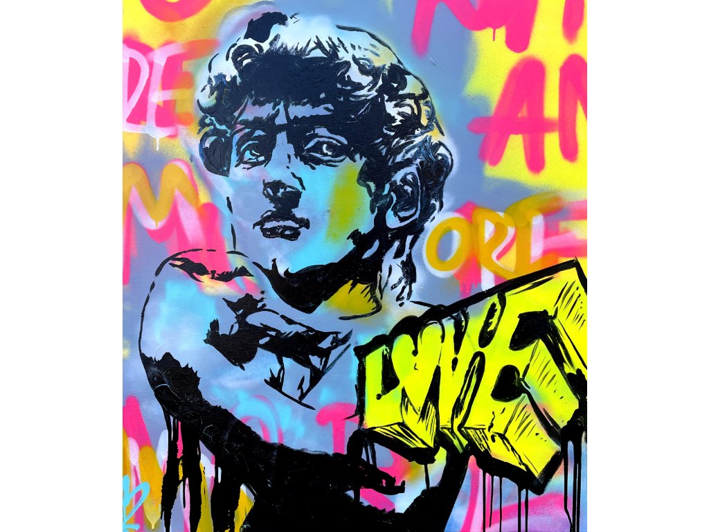 Klasická sochařská ikona v kontrastu s výbuchem barev, graffiti nápisů a pop-artových symbolů. Nečekané spojení minulosti a současnosti v energickém kolážovitém provedení.