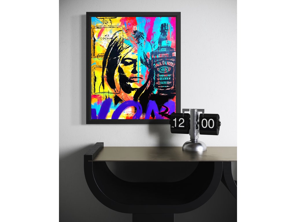 Ikonická tvář popu ve víru barev, rebelie a neposedné street‑artové koláže. Výrazný giclée tisk na kvalitním papíře